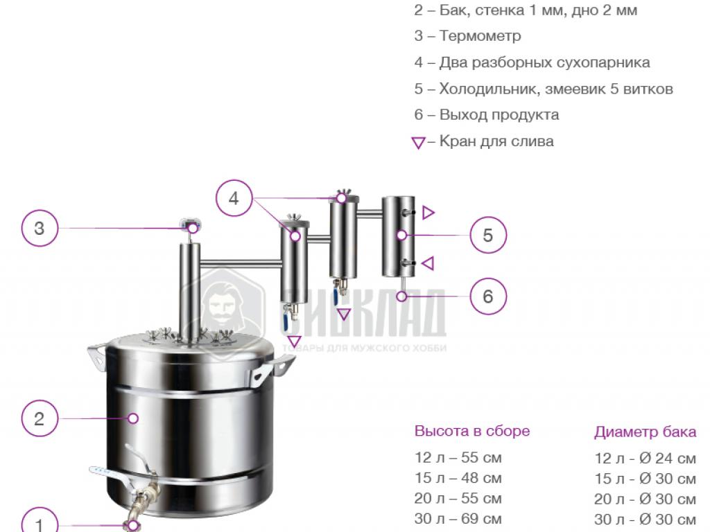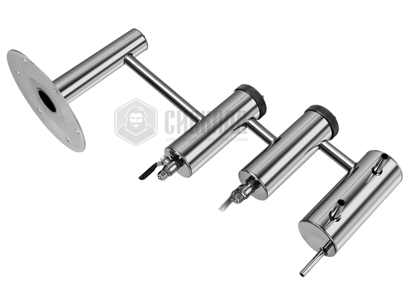 • Двумя последовательно установленными разборными сухопарниками с кранами для слива флегмы – именно за счет них крепость готового самогона может достигать 70% с первого перегона. Кроме того, в сухопарники можно помещать натуральные ароматические добавки для придания самогону соответствующего привкуса и аромата