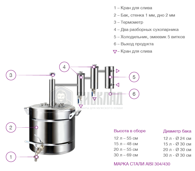 Дистиллятор «Локомотив» поставляется в комплекте с перегонным кубом из пищевой нержавеющей стали толщиной 1-1,5 мм, который обеспечивает быстрый и равномерный прогрев браги на плитах всех типов. Ребра жесткости не дают емкости деформироваться, а широкая горловина делает использование максимально удобным. Фланец крепится при помощи барашков. Удобство и производительность аппарата обеспечивается следующими элементами: