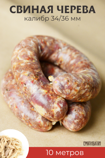 Свиную череву 34/36 мм обычно используют для набивки тонких колбасок для жарки, мюнхенских колбасок, сыровяленых колбасок. Колбаски в узкой череве быстро готовятся на гриле, буквально за минуты. Сыровяленые колбаски в череве калибром от 32 до 38 мм быстро вялятся и цикл их производства обычно занимает 8-14 дней.