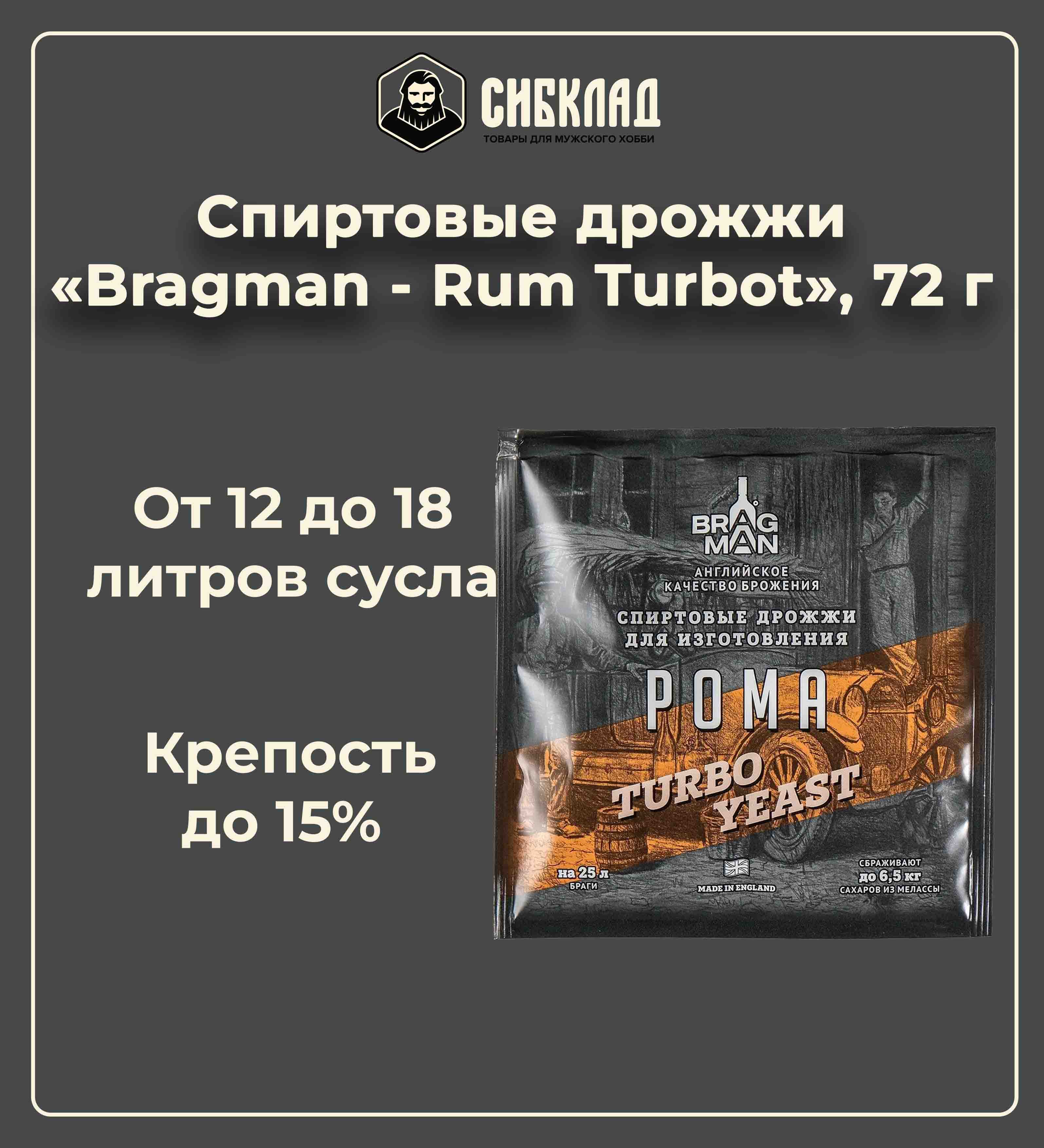 Спиртовые дрожжи Bragman Rum Turbo позволят вам приготовить брагу высочайшего уровня и качества на основе или совместно с мелассой. При перегонке браги вы получите великолепный букет аромата и будете приятно удивлены качеством получаемого продукта. Содержат фермент глюкоамилазы, который разбивает декстрины из мелассы.