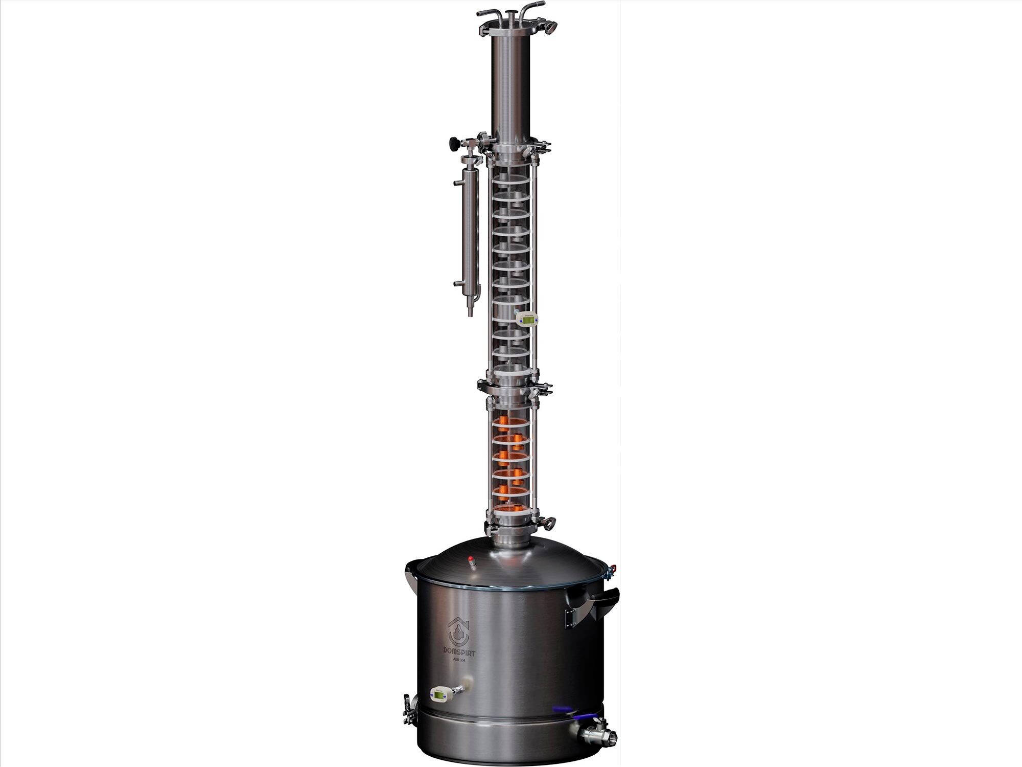 А для быстрого нагрева нужно мощное охлаждение! 2 мощных теплообменника DomSpirt 2 справляются с нагревом до 7 кВт. Димрот из нержегофры (самый эффективный на единицу высоты) эффективно конденсирует пары. А 3-трубный доохладитель быстро охлаждает полученный дистиллят. При нагреве только на плите (или одним тэном) мощные теплообменники в 2-3 раза сократят расход воды и затраты на ЖКХ. Аппарат работает на любых типах плит за счет индукционного 3-слойного дна.