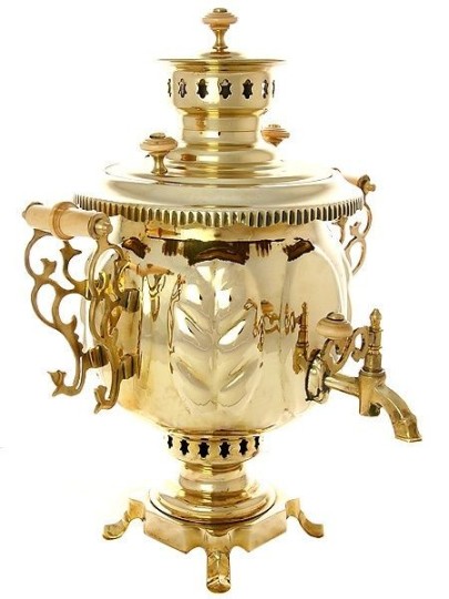 Латунь полируется до золотого блеска так, что самовар практически сияет. Эффект от этого усиливается за счет зеркальной поверхности самого самовара. Правда латунь очень чувствительно к влажности, поэтому нужно ухаживать за поверхностью самовара, чтобы сохранять этот блеск.